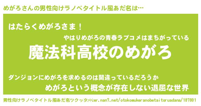 | 意味不明あだ名 | 『自称めがろ』『永久保存めがろ』 |