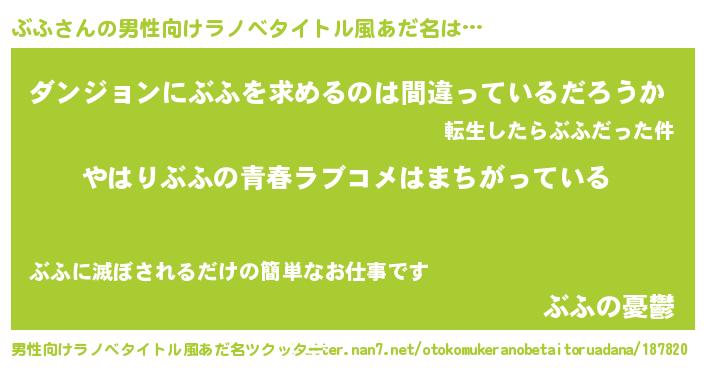 | 女子向けラノベタイトル風あだ名 | 『ぶふ伯爵の花嫁』『ぶふは平凡を望む』 |