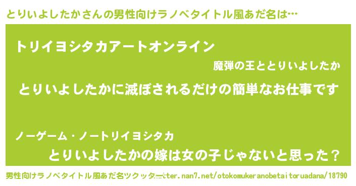 | 胡散臭い通販商品みたいなあだ名 | 『億万長者になれるブレスレット…その名も「とりいよしたか」』 |