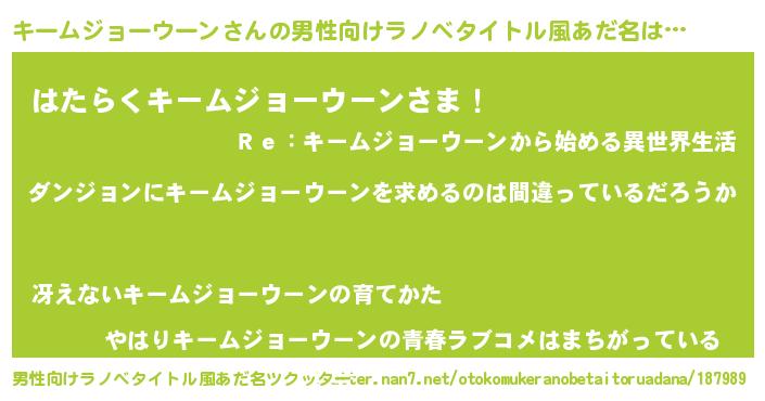 | 女子向けラノベタイトル風あだ名 | 『キームジョーウーンの卵を拾いまして』 |