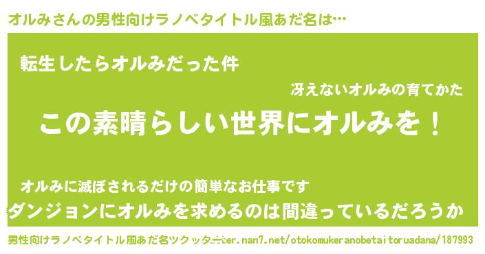 | 女子向けラノベタイトル風あだ名 | 『悪役オルみに転生したようですが、知った事ではありません』 |
