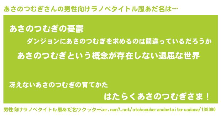 | 胡散臭い通販商品みたいなあだ名 | 『絶対に幸福をもたらす水素水…その名も「あさのつむぎ」』 |