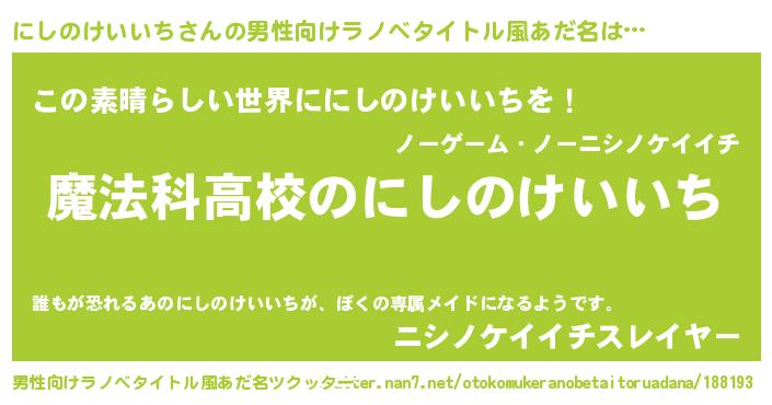 | 女子向けラノベタイトル風あだ名 | 『にしのけいいちなんてお断りですっ。』 |