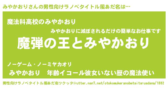 | 女子向けラノベタイトル風あだ名 | 『乙女ゲームの破滅フラグしかない悪役みやかおりに転生してしまった…』 |