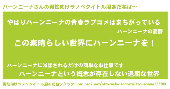 | 女子向けラノベタイトル風あだ名 | 『乙女ゲームの破滅フラグしかない悪役ハーンニーナに転生してしまった…』 |
