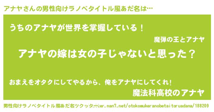 | ヒーロー風カッコイイあだ名 | 『炎刃騎士アナ』『サイバー戦士アナヤ』 |