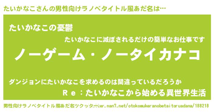 | 女子向けラノベタイトル風あだ名 | 『死神たいかなこの再婚』 |
