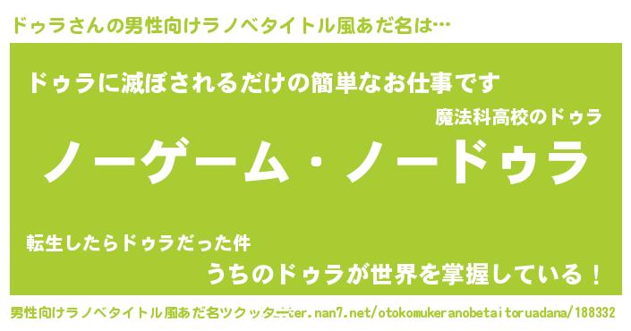 | 女子向けラノベタイトル風あだ名 | 『死神ドゥラの再婚』 |