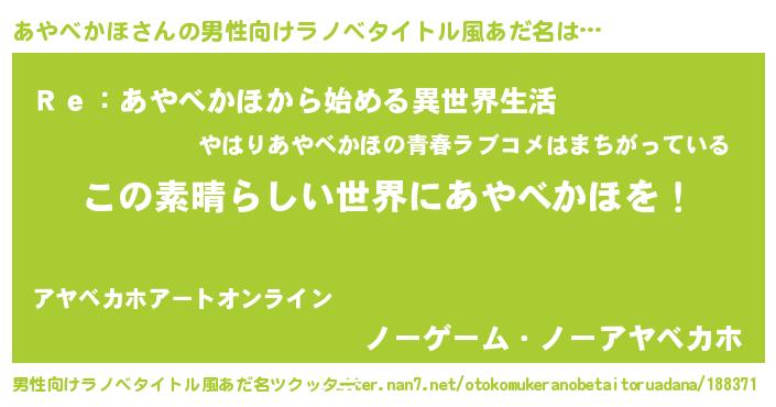 | 女子向けラノベタイトル風あだ名 | 『悪役あやべかほに転生したようですが、知った事ではありません』 |
