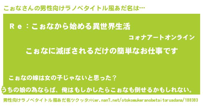 | ヒーロー風カッコイイあだ名 | 『最強戦士コォナ』『ウルトラこぉなマン』 |