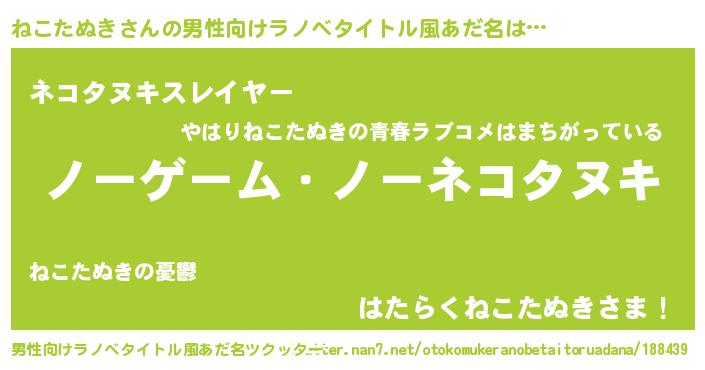 | 女子向けラノベタイトル風あだ名 | 『死神ねこたぬきの再婚』 |