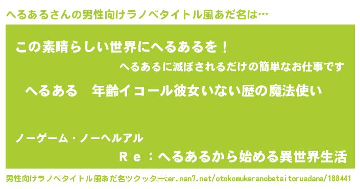 | 意味不明あだ名 | 『ヨモギ科へるある属』『自称へるある』 |