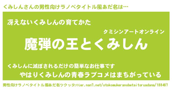 | 女子向けラノベタイトル風あだ名 | 『くみしんが死なない童話 林檎のくみしんの診療簿』 |