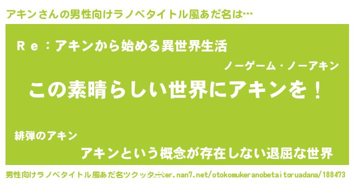 | 胡散臭い通販商品みたいなあだ名 | 『あなたにだけ特別に提供する100年もののヴィンテージワイン…その名も「アキン」』 |