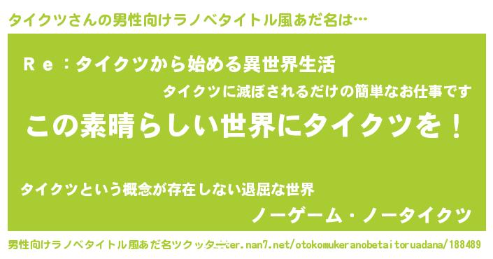 | 意味不明あだ名 | 『住所不定無職タイクツ(9歳)』 |