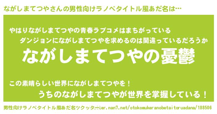 | 女子向けラノベタイトル風あだ名 | 『(仮)ながしまてつやのやんごとなき事情』 |
