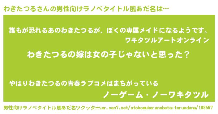 | 女子向けラノベタイトル風あだ名 | 『わきたつるの卵を拾いまして』 |
