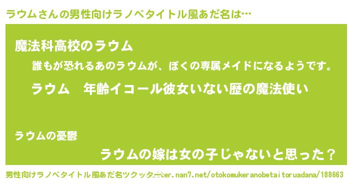 | 女子向けラノベタイトル風あだ名 | 『ラウムの玉の輿計画!』 |