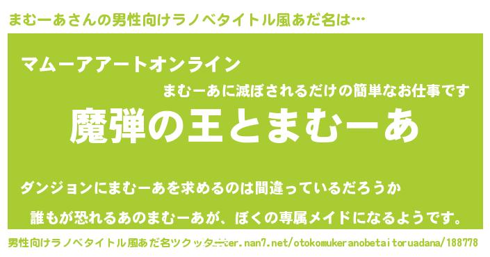 | 女子向けラノベタイトル風あだ名 | 『まむーあが死なない童話 林檎のまむーあの診療簿』 |
