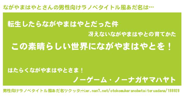 | 女子向けラノベタイトル風あだ名 | 『悪役ながやまはやとに転生したようですが、知った事ではありません』 |