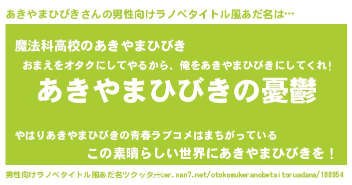 | 女子向けラノベタイトル風あだ名 | 『(仮)あきやまひびきのやんごとなき事情』 |
