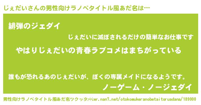 | 女子向けラノベタイトル風あだ名 | 『じぇだいの雑貨屋さん』 |