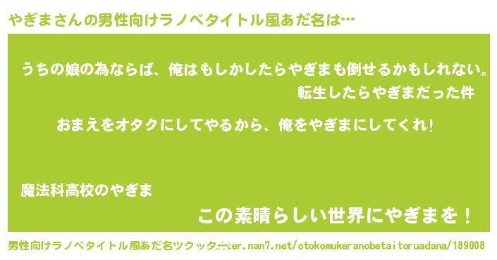 | 女子向けラノベタイトル風あだ名 | 『やぎま夫妻のなれそめ』 |