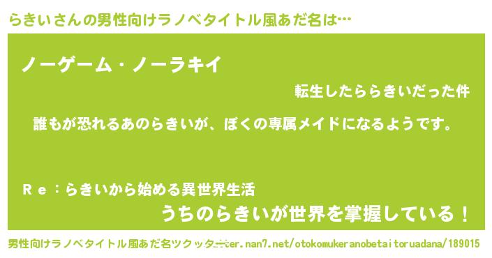 | 女子向けラノベタイトル風あだ名 | 『らきいの契約王妃』『死神らきいの再婚』 |