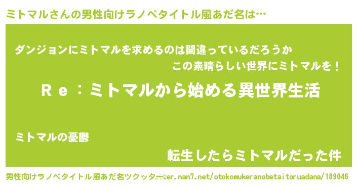 | 女子向けラノベタイトル風あだ名 | 『闇のミトマル』『ミトマルは平凡を望む』 |
