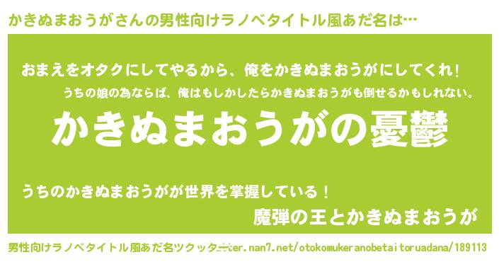 | 女子向けラノベタイトル風あだ名 | 『(仮)かきぬまおうがのやんごとなき事情』 |