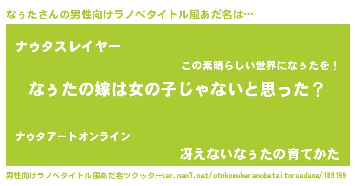 | 女子向けラノベタイトル風あだ名 | 『なぅたの卵を拾いまして』 |