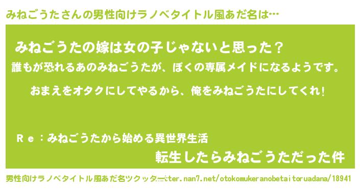 | 女子向けラノベタイトル風あだ名 | 『みねごうた夫妻のなれそめ』 |