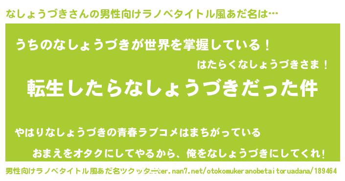 | 女子向けラノベタイトル風あだ名 | 『なしょうづきの玉の輿計画!』 |