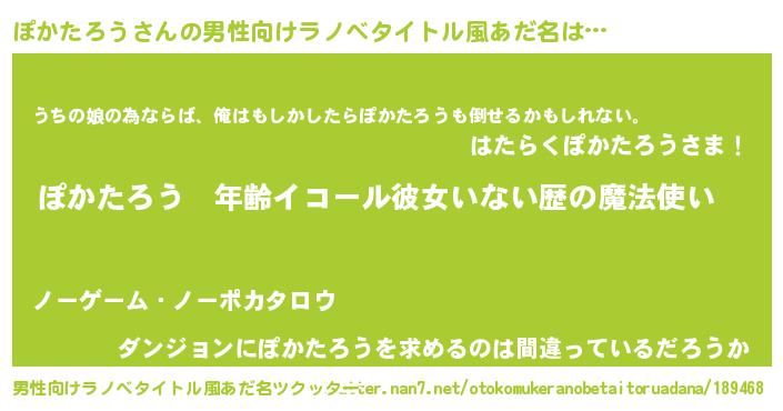 | 女子向けラノベタイトル風あだ名 | 『ぽかたろうの玉の輿計画!』 |