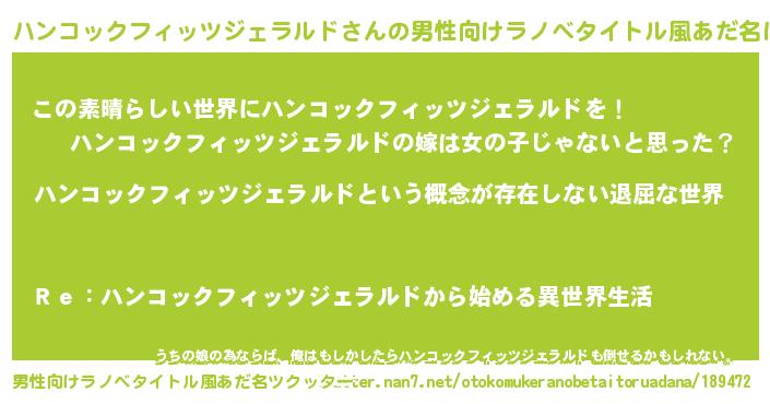 | 胡散臭い通販商品みたいなあだ名 | 『来世でも幸せになれる水素水…その名も「ハンコックフィッツジェラルド」』 |