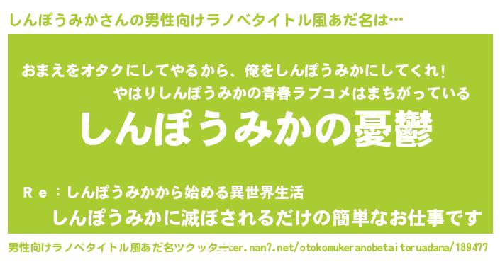 | 女子向けラノベタイトル風あだ名 | 『(仮)しんぽうみかのやんごとなき事情』 |