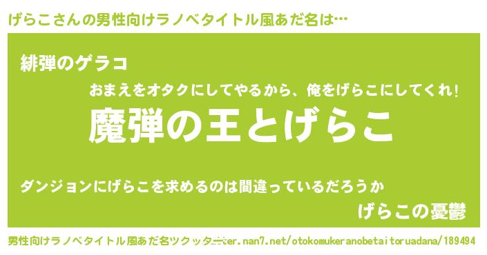 | 女子向けラノベタイトル風あだ名 | 『げらこが死なない童話 林檎のげらこの診療簿』 |