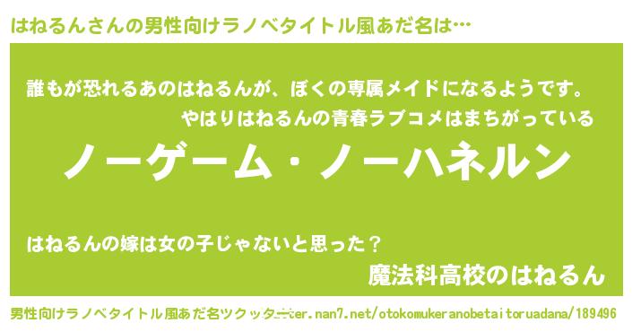 | 女子向けラノベタイトル風あだ名 | 『死神はねるんの再婚』 |