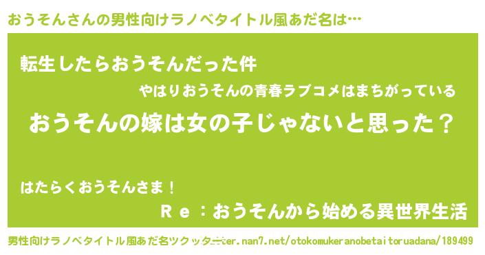 | 女子向けラノベタイトル風あだ名 | 『おうそんの卵を拾いまして』 |