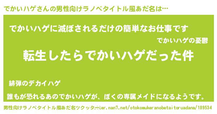 | 胡散臭い通販商品みたいなあだ名 | 『来世でも幸せになれる水素水…その名も「でかいハゲ」』 |
