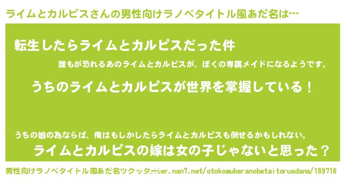 | 胡散臭い通販商品みたいなあだ名 | 『全米が絶賛したサプリメント…その名も「ライムとカルピス」』 |