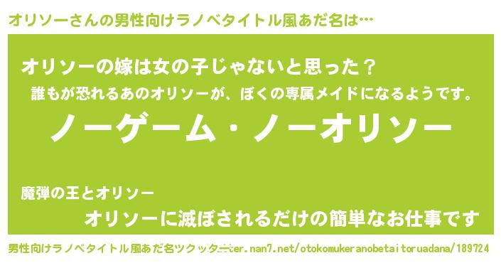 | 女子向けラノベタイトル風あだ名 | 『死神オリソーの再婚』 |