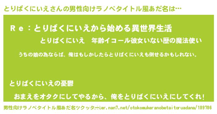 | 女子向けラノベタイトル風あだ名 | 『とりばくにいえの婚約者』 |