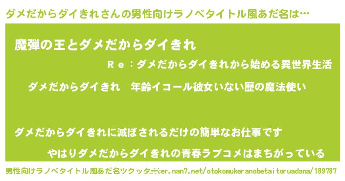 | 女子向けラノベタイトル風あだ名 | 『ダメだからダイきれの玉の輿計画!』 |