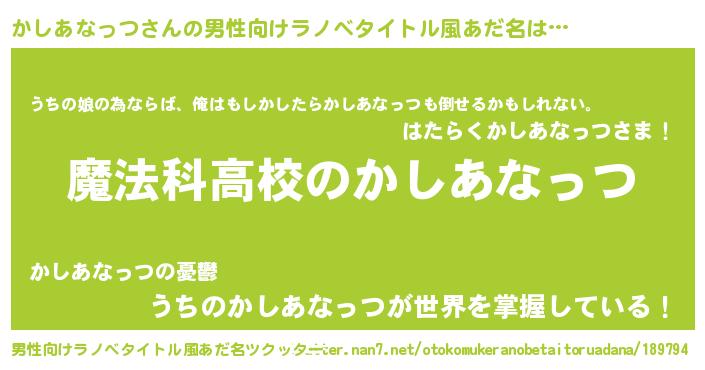 | 肩書あだ名 | 『かしあなっつ総統』『かしあなっつ機長』 |