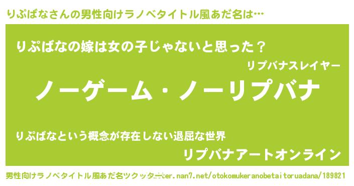 | 女子向けラノベタイトル風あだ名 | 『死神りぷばなの再婚』 |