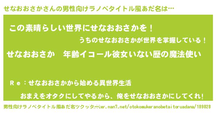 | 女子向けラノベタイトル風あだ名 | 『せなおおさかの玉の輿計画!』 |