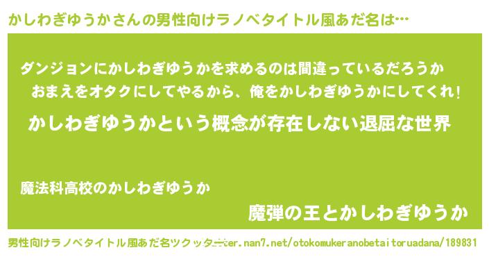 | 女子向けラノベタイトル風あだ名 | 『異世界で失敗しない100のかしわぎゆうか』 |