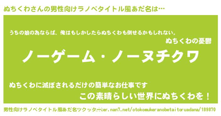 | 女子向けラノベタイトル風あだ名 | 『ぬちくわ恋絵巻』『ぬちくわの婚約者』 |