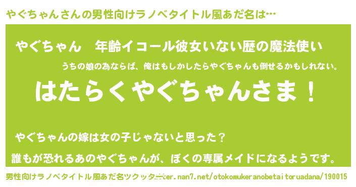 やぐちゃんさんの男性向けラノベタイトル風あだ名をツクッター!